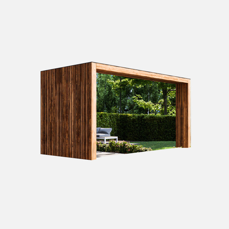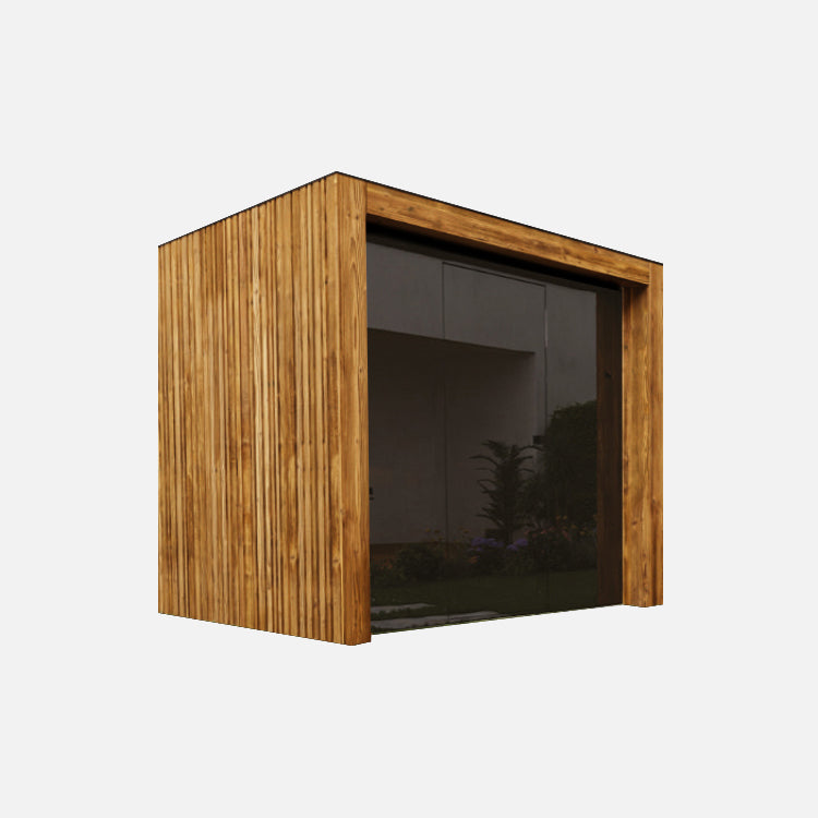 2 Seiten TyrolHolz Vertikal-Lamellen mit rückversetzter Spiegelglasfront; Trapez-Vertikal-Dachblech auf der Rückseite